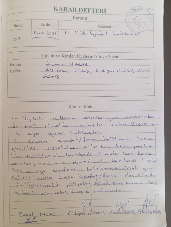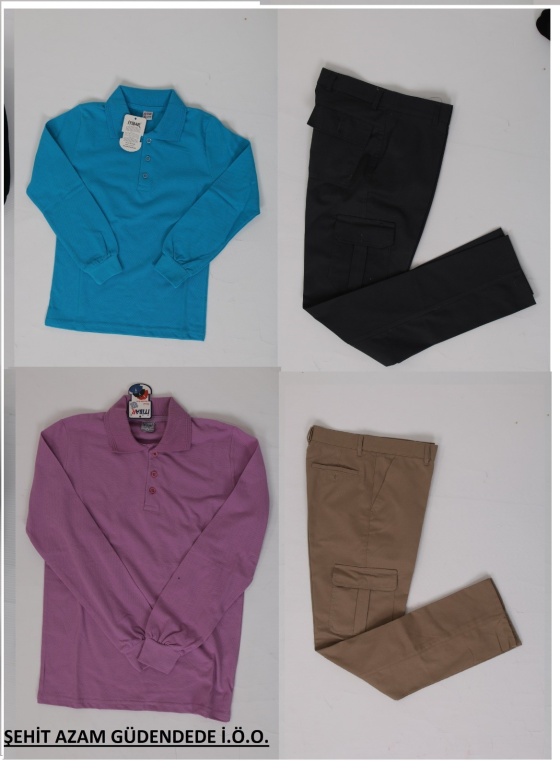 Okul kıyafeti erkek öğrenciler için mavi tişört ve füme pantolon; kız öğrenciler için lila tişört ve krem pantolon olarak belirlenmiştir.